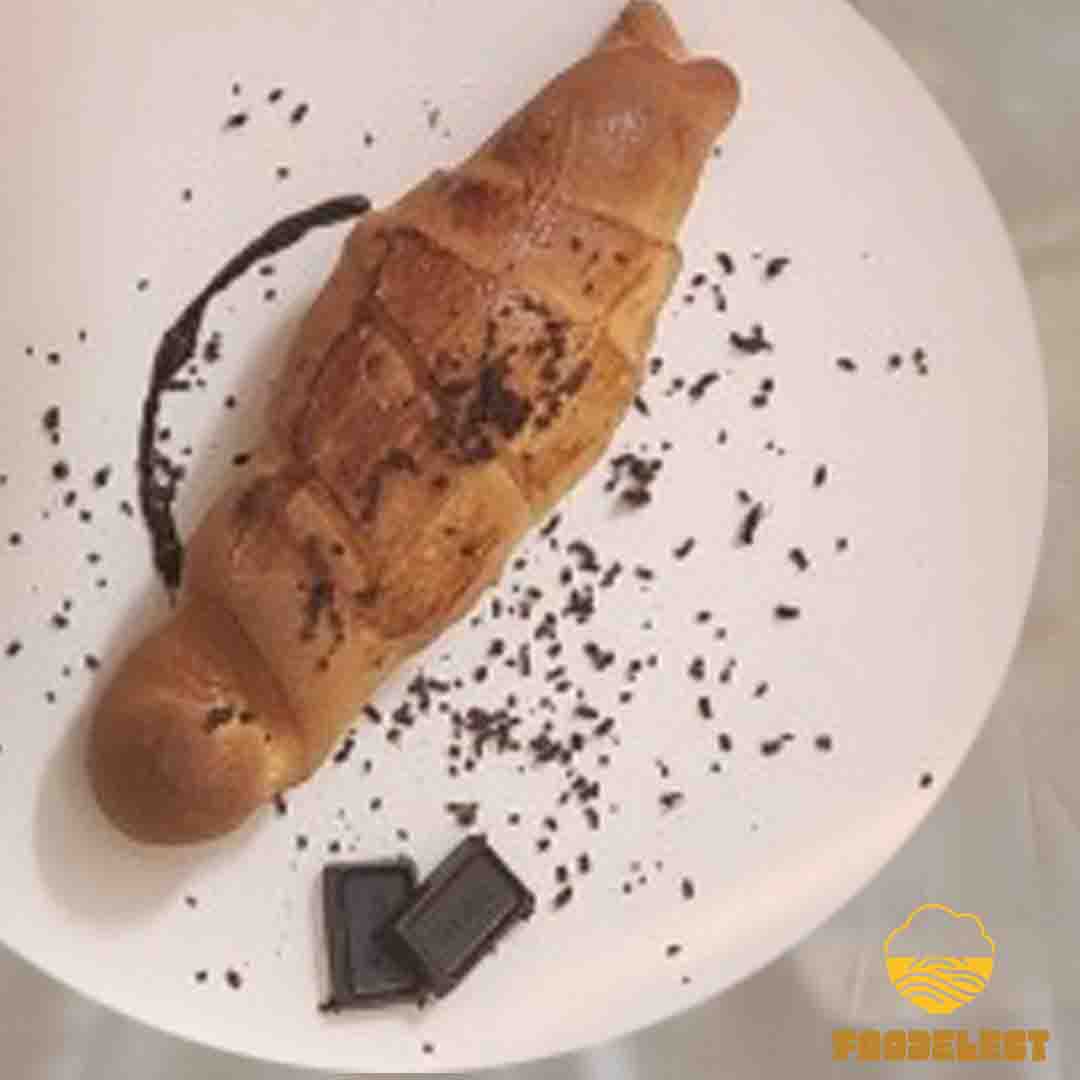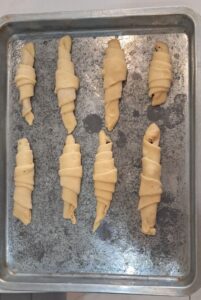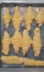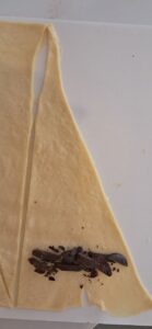 At the base of each triangle, make a small cut (~1.5 cm), place a chocolate bar inside, and roll into croissant shape.