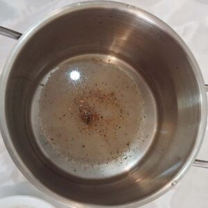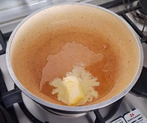 In a non-stick pan, melt the butter and oil together. Add the toasted flour and stir continuously over low heat until the mixture darkens to a rich coffee-like color.