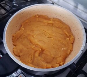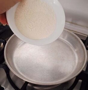In a dry stainless-steel pan, roast the flour over low heat for 10–15 minutes, stirring frequently, until it turns a light golden brown and gives off a nutty aroma.