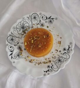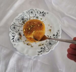 In a small saucepan, combine the water, sugar, and crushed cardamom pods. Bring to a boil over high heat, stirring until the sugar dissolves completely. Remove from heat, cover, and let the cardamom steep for a few minutes. Stir in the rose water and brewed saffron. Set the syrup aside.