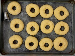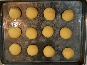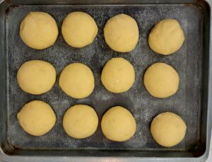 • Roll each piece into a smooth, tight ball and place them on a floured baking tray, leaving space between each.