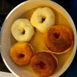 • Carefully slide the doughnuts from the tray into the hot oil using a floured pastry scraper. Fry in batches of 2-3, depending on your fryer or pan size.